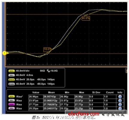 在使用DPO/DSA73304D的情況下,使用這種方法確定出9ps的上升時間。但是,信號速度可以被測量的意思是什麽(me) 呢?根據正確的經驗法則,信號上升時間與(yu) 示波器上升時間的比值為(wei) 2x或>18ps。事實證明,對於(yu) 當今最快的FPGA設計中使用的28Gb/s的串行解串器(SerDes)而言,這是指定的上升時間。