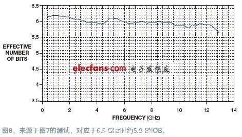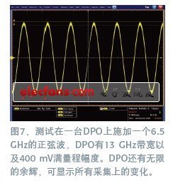 ENOB性能表明,噪聲會(hui) 同時影響到幅度和時序測量。為(wei) 了演示噪聲對幅度的影響,在一台13 GHz帶寬,400 mV滿量程電壓的Tektronix DPO/DSA70000B示波器上加了一個(ge) 6.5 GHz的正弦波。它還有無限大的顯示餘(yu) 輝,這樣可以看到所有采集的變動。在不作平均時,測試運行包含了大約1萬(wan) 次采集。結果在峰值時軌跡粗細約為(wei) 15.9 mV,相當於(yu) 該示波器滿量程的3%(圖7)。這個(ge) 結果對應於(yu) 6.5 GHz時約5.9 ENOB(圖8)。采用相同測試設置時,比較性測試表明其它示波器的峰值時軌跡粗在35 mV以上,ENOB約4.5。