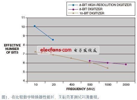 圖1中顯示,當數字信號的頻率增高時,有效的數字轉換精度會(hui) 劣化。此時,8 位數字轉換器隻有在直流和低頻下才能提供8個(ge) 有效精度位。當數字轉換的信號頻率或速度升高時,性能會(hui) 下降到較小的有效位數。