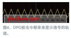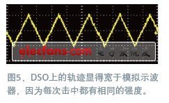 采用CRT顯示屏的模擬示波器並不會(hui) 顯示噪聲的極值範圍,因為(wei) 它們(men) 出現得很快,很少見(圖4),這意味著磷光也一閃而過,因此這些極值範圍很暗,或根本無法在屏幕上顯示。模擬儀(yi) 器不會(hui) 顯示各個(ge) 時間上的電壓,但有一個(ge) 第三尺度:亮度。亮度與(yu) 信號發生的頻率有關(guan) 。一個(ge) DSO(數字信號示波器)會(hui) 以相同亮度,顯示每個(ge) bit,無論像素被擊中的頻率如何(圖5)。DPO(數字熒光示波器)提供了一種存儲(chu) 第三尺度的方式,即根據擊中的頻率對信號劃分等級(圖6)。