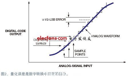 與(yu) 數字轉換有關(guan) 的噪聲或誤差可以有多個(ge) 來源。即使是一個(ge) 理想的數字轉換器,量化也會(hui) 產(chan) 生一個(ge) 最小噪聲,或相當於(yu) ±½ LSB的誤差水平。這個(ge) 誤差是數字轉換過程的固有部分(圖2)。這是與(yu) 理想數字轉換相關(guan) 的分辨率限製,或不確定性。一款真實的數字轉換器會(hui) 在這個(ge) 理想的基本誤差水平上增加更多的誤差。這些額外的實際誤差可以包括:直流偏移;交流偏移,或“模式”誤差,有時也叫做固定模式失真,它與(yu) 交互式采樣方式有關(guan) ;直流與(yu) 交流增益誤差;模擬非線性;還有數字非單調性。另外還必須考慮相位誤差;隨機噪聲;頻率-時基不精確性;孔徑不確定性,或叫采樣時間抖動;數字誤差,如由於(yu) 亞(ya) 穩態、丟(diu) 失碼等所導致的數據損失;以及其它誤差源,如觸發器抖動。