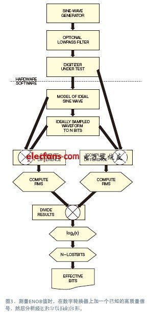 要獲得ENOB,必須計算一個(ge) 完美的(或理想的)正弦波,並將其加到自己的示波器上,使其適配於(yu) 數字轉換的正弦波。這種方法模擬了一個(ge) 理想的N bit待測數字轉換器可產(chan) 生的內(nei) 容。然後,可以計算出理想正弦波與(yu) 經過完美采樣和數字轉換的波形之間的差值。這個(ge) 差的rms值就是理想量化誤差。在ENOB方程中,從(cong) 實際數字轉換正弦波中減去理想正弦波,找到結果的rms值,就得到了rms誤差值。另外,可以找出信號的rms值和rms誤差,用它們(men) 計算出SNR。最後的計算就得到了數字轉換器的一個(ge) ENOB。對各種頻率都保持輸入信號幅度為(wei) 常數,就可以進一步計算出目標數字轉換器或數字轉換係統的各個(ge) ENOB。然後繪出不同頻率下的這些數值圖,獲得一個(ge) 數字轉換器的性能曲線。