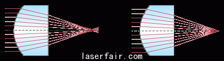 非球麵透鏡用以替換球麵透鏡,最顯著的優(you) 勢在於(yu) 可以修正球麵透鏡在準直和聚焦係統中所帶來的球差。通過調整曲麵常數和非球麵係數,非球麵透鏡可以最大限度的消除球差。如圖2,右圖非球麵透鏡(光線匯聚到同一點,提供光學品質),基本上消除了左圖球麵透鏡所產(chan) 生的球差(光線匯聚到不同點,導致成像模糊)。