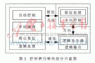 步進電機在具有一定轉換方向的驅動脈衝(chong) 下運行,據此將電機控製器劃分為(wei) 方向控製和邏輯輸出兩(liang) 個(ge) 部分。限位信號用於(yu) 複位和限定運行方向,因此在方向控製部分同時處理限位;在邏輯輸出部分,按照控製需求再次劃分為(wei) 複位、自動和手動三個(ge) 邏輯處理模塊,在邏輯輸出的實現方式上,複位、自動和手動通過一定的優(you) 先級邏輯,通過發送電機占用請求複用邏輯輸出模塊。圖3為(wei) 控製器模塊劃分示意圖。