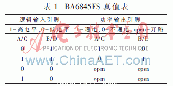 功率驅動單元可以使用MOS管等分立元件或專(zhuan) 用集成電路實現[5]。為(wei) 了減少電路規模,采用專(zhuan) 用驅動芯片BA6845FS完成功率轉換。該芯片具有四路電平轉換,支持二相雙四拍驅動方式;輸出飽和電壓低、內(nei) 置節電和過熱保護電路,可以降低電路功耗,同時提高電路可靠性。其真值表如表1所示[6]。從(cong) 表1中可以看出,當控製器沒有接到電機運行指令時,可以設置邏輯發生器的輸出B/D為(wei) 0,使步進電機的繞組處於(yu) 開路狀態,防止電機發熱。