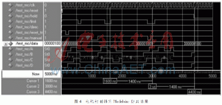 使用測試台(testbench)程序在Modelsim中對步進電機控製器進行功能仿真。仿真時鍾周期為(wei) 100 ns,仿真結果如圖4所示。測試台程序在預定的時間點自動修改輸入端口寄存器的值,並監視邏輯發生器的輸出。在評價(jia) 功能仿真輸出結果時,主要查看自動、手動和複位3個(ge) 模塊的仿真輸出邏輯是否按測試台程序要求轉換了預定的次數,同時檢查限位和停止功能是否有效。