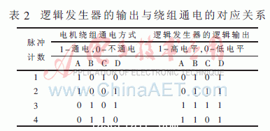 根據表1的功率轉換方式,可以得到邏輯發生器的輸出邏輯與(yu) 二相雙四拍繞組通電方式的對應轉換關(guan) 係,如表2所示。表2中1代表高電平,磁極繞組通電;0代表低電平,磁極繞組不通電。