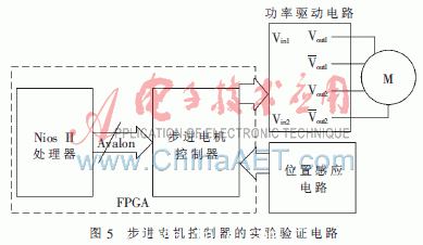 步進電機控製器的實驗驗證電路如圖5所示。嵌入Nioses II處理器的片上可編程係統(SoPC)在ALTERA DE2開發板的FPGA中建立,同時設計了位置感應電路和功率驅動電路,用來驗證複位和限位功能以及驅動步進電機。