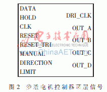 圖2中DATA為(wei) 電機自動運行的步數,HOLD控製電機停止,MANUAL為(wei) 手動觸發信號,DIRECTION用於(yu) 控製運行方向,RESET_TRI為(wei) 爬山搜索複位信號,四路OUT信號為(wei) 步進電機的輸出邏輯,用於(yu) 四線製步進電機的驅動控製。通過控製輸出邏輯的頻率DRI_CLK可以控製步進電機運行速度,而輸出邏輯的轉換方向則控製了步進電機的運行方向[3]。