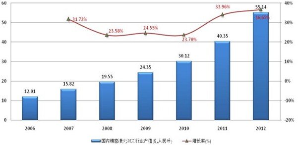 根據國家科技部基礎研究司《我國激光產(chan) 業(ye) 發展對策》研究報告顯示,國外已建立有約5000個(ge) 激光加工站,而我國現隻有120個(ge) 左右的激光加工站或加工中心,未來發展具有很大的潛力。根據統計,2008年我國與(yu) 電子信息行業(ye) 相關(guan) 的專(zhuan) 業(ye) 精密激光製造和服務業(ye) 收入19.55億(yi) 元,隨著精密激光對傳(chuan) 統製造的不斷地替代和突破,精密激光製造正不斷地滲透到傳(chuan) 統製造中,保守估計,未來三年內(nei) 我國精密激光加工行業(ye) 將保持平均每年30%的增長率,中國精密激光製造與(yu) 服務行業(ye) 的產(chan) 值將由2008年的19.55億(yi) 元人民幣增長到2012年的55.14億(yi) 元,市場容量較大,市場前景良好。