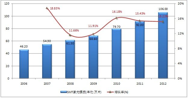 首先,我們(men) 先討論激光漏印模板中的SMT激光模板,下表是2006~2012年中國SMT激光模板的市場容量估計圖: