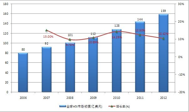 根據台灣工研院IEK 統計數據,2007年HDI板全球市場規模增長15%達到92億(yi) 美元,2008年達到101億(yi) 美元,2006-2008年年複合成長約13.5%,預計到2009年將達到112億(yi) 美元,未來幾年仍可保持10%以上的增長速度。