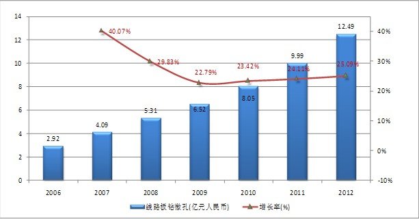 CPCA(中國印刷電路行業(ye) 協會(hui) )統計,2006年至2008年國內(nei) HDI市場成長速度達30%以上,2006年中國HDI使用麵積達到285萬(wan) 平方米。根據HDI平均每平方米232500孔,每千孔加工價(jia) 格0.80元,外包比例55%測算,2006年HDI鑽孔外包市場規模達到2.92億(yi) 元,2007年增長40%,達到4.09億(yi) 元,2008年增長30%,市場規模為(wei) 5.31億(yi) 元。預計2009年市場規模為(wei) 6.52億(yi) 元,至2012年市場規模為(wei) 12.49億(yi) 元。以下是中國線路板鑽微孔的市場容量預測: