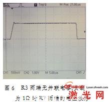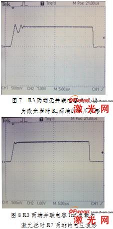 上述各個(ge) 電路模塊都預先在Pspice A/D上進行了仿真和優(you) 化,最後製作了實物電路,試驗結果達到了預期的設想。當負載為(wei) 純電阻1Ω、脈衝(chong) 控製信號周期1ms、脈寬約40us、R3兩(liang) 端無並聯電容時,R7兩(liang) 端的電壓波形如圖6所示。從(cong) 前麵可知,R7兩(liang) 端的電壓與(yu) 流過負載的電流完全對應,隻差一個(ge) 比例係數。從(cong) 示波器上的看出,恒流脈衝(chong) 的上升時間約2us,下降時間約1us,在同樣的條件下,負載為(wei) 808nm大功率半導體(ti) 激光器時R7兩(liang) 端的電壓波形如圖7所示。前麵負載選用純電阻1Ω的原因是: 2A電流流過激光二極管時,穩態下該激光器的等價(jia) 負載電阻約1Ω,這樣可以更好的對比他們(men) 的工作情況。從(cong) 示波器上可以看出,在上升階段,有一段持續時間約5us的衰減振蕩,這主要是因激光二極管到在達穩態之前,它的阻抗特性變化較大,如寄生電感和電容。從(cong) 電路原理上分析,在R3兩(liang) 端並聯一個(ge) 電容C8是可以消除這種性能的惡化,通過試驗測得,電容取值在1-2nf之間比較合適,電容取值過小,震蕩不能完全消除,取值過大會(hui) 使得脈衝(chong) 緩慢沿著斜坡上升,響應變慢。圖8顯示了電容為(wei) 1nf時R7兩(liang) 端的電壓波形,可見,輸出特性改善了許多。這也說明對於(yu) 恒流源,負載的阻抗特性,如並聯電感、串聯電容對電源輸出的瞬態特性影響很大!在用恒流源驅動半導體(ti) 激光器時要特別注意。