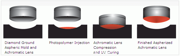 混合成型,以球麵透鏡為(wei) 基底,通過非球麵模具在球麵透鏡表麵壓鑄並采用紫外光固化上一層高分子聚合物的非球麵體(ti) 。混合成型,一般采用消色差球麵透鏡為(wei) 基底,表麵壓鑄一層非球麵,用以實現同時消除色差和球差。圖7是混合成型非球麵透鏡的製造工藝流程。混合成型非球麵透鏡, 適用於(yu) 需要附加特性(同時消除色差和球差),大批量製造的場合。