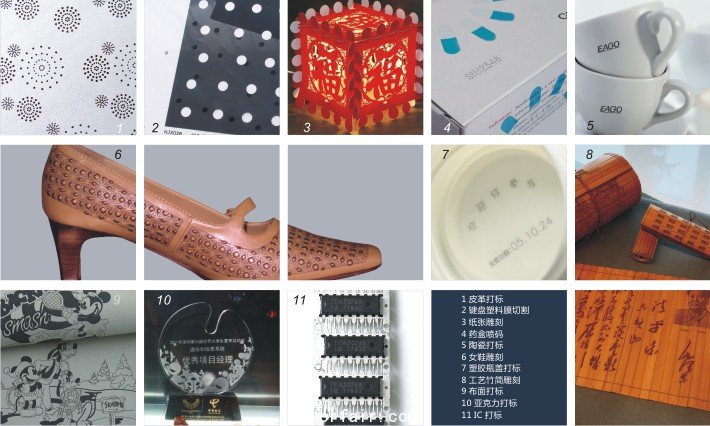 - 可雕刻非金屬和部分金屬材料。廣泛應用於(yu) 食品包裝、飲料包裝、醫藥包裝、建築陶瓷、服裝輔料、皮革、鈕扣、織物切割、工藝禮品、橡膠製品、電子元件、外殼銘牌。