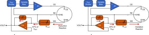 相對傳(chuan) 統設計,另一個(ge) 傳(chuan) 感器模擬前端電路可以發揮巨大優(you) 勢的多傳(chuan) 感係統應用是在需要用同一儀(yi) 器設計感應多種不同氣體(ti) 的有毒氣體(ti) 檢測器時。有些有毒氣體(ti) 傳(chuan) 感器在特定氣體(ti) 中會(hui) 發生氧化反應,而其它傳(chuan) 感器可能發生還原反應。傳(chuan) 統的解決(jue) 方案要求能夠調節用於(yu) 測量流經傳(chuan) 感器的電流的跨導放大器(TIA)的偏置電壓。對於(yu) 電流流出傳(chuan) 感器工作電極(WE)時的還原反應,偏置電壓需要設定為(wei) 正參考值,以防止電流變大時TIA的輸出在近地附近限幅。氧化反應下,電流會(hui) 流入傳(chuan) 感器的工作電極,為(wei) 此偏置電壓需要設定在地附近,以防止TIA的輸出在正電源附近飽和。這可以通過幾種定製的分立式設計方式實現,一種方案是采用雙極性電源,它在地附近為(wei) TIA的輸入加設偏置電壓,使其可以在任一方向上變化。另一種方案是針對特定類型的有毒氣體(ti) 傳(chuan) 感器,利用外部數模轉換器(DAC)或模擬開關(guan) 改變從(cong) 地附近到正電源電壓附近的偏置電壓。此外,還有一種備選方案是采用LMP91000,它針對TIA輸入集成了可編程偏置電壓,該方法可以以單一正電源電壓為(wei) 兩(liang) 類化學反應正常供電。有毒氣體(ti) 檢測器的另一個(ge) 設計挑戰是需要檢測電流的動態範圍。一些有毒氣體(ti) 傳(chuan) 感器的滿量程範圍為(wei) 600 uA、靈敏度為(wei) 10nA/ppm,而其他的傳(chuan) 感器滿量程範圍可能為(wei) 10 uA、靈敏度為(wei) 1 nA/ppm。解決(jue) 這一問題同樣有多種解決(jue) 方案。為(wei) 了在寬電流範圍內(nei) 提供足夠的測量分辨率,相對於(yu) 傳(chuan) 統的12位模數轉換器,定製方案需要16或24位高分辨率模數轉換器,它雖然在整個(ge) 電流範圍內(nei) 確保了所需的分辨率,但數模轉換器的成本大幅提高。另一個(ge) 選擇是利用模擬開關(guan) 切換不同的反饋電阻值,以改變TIA的增益,這樣就能使用12位模數轉換器並更好地利用模數轉換器的動態範圍獲得所需的性能。LMP91000內(nei) 置從(cong) 2kΩ 到375kΩ的可編程反饋電阻和可切換到外部反饋電阻的性能選項從(cong) 而解決(jue) 了這一難題。最後,有些應用還要求控製有毒氣體(ti) 傳(chuan) 感器工作電極(WE)與(yu) 參考電極(RE)之間的電勢差,有些傳(chuan) 感器如一氧化碳傳(chuan) 感器需要零偏置電壓,即要求RE和WE在相同的電位上。而,有些氣體(ti) 傳(chuan) 感器如一氧化氮傳(chuan) 感器需要正偏置電壓,另外一些傳(chuan) 感器則需要負偏置電壓,定製設計可以通過綜合利用模擬開關(guan) 、多種參考電壓和/或模數轉換器而實現。LMP91000通過提供從(cong) +24%的VREF到-24%的VREF的可編程偏置電壓得以解決(jue) 這一問題。