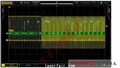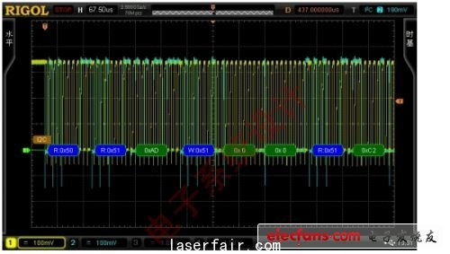 同樣,在下載固件時可以通過使用DS6104來監測I2C的通信數據,並且可以明顯看到時鍾頻率的變化,如圖8所示。