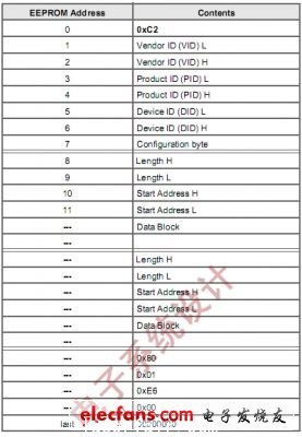 我們(men) 按照圖7所示的Cypress文檔提供的寄存器配置格式,配置固件為(wei) 啟動時斷開USB連接,並將I2C時鍾設置為(wei) 400KHz(將地址7數據修改為(wei) “0x41”)。