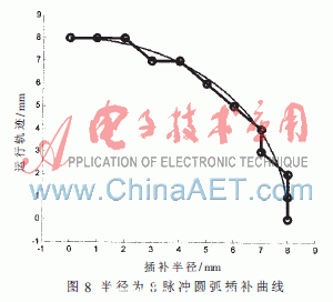 基於(yu) 最小偏差法的插補模塊被封裝在FPGA中,但其算法在Matlab環境下進行了仿真,圖8所示為(wei) 半徑為(wei) 8個(ge) 脈衝(chong) 當量的運行軌跡,實現了實際軌跡與(yu) 理想曲線之間的最小偏差。
