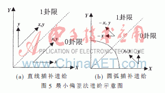 精插補模塊的實現原理有很多種,對於(yu) 直線和圓弧插補,常用的插補原理有逐點比較法、最小偏差法、數字脈衝(chong) 相乘法等。最小偏差比較法是在逐點比較法的基礎上衍生而來的,其原理是在進給之前先判定向x坐標方向或y坐標方向進給一步的偏差和向對角線進給一步的偏差(向x軸與(yu) y軸同時進給一步),應選擇偏差小的那個(ge) 方向進給[4]。