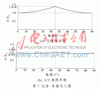 設脈衝(chong) F單獨驅動單軸運動的速度為(wei) Vf,合成速度為(wei) V。可以畫出V/Vf隨α的變化的曲線圖,如圖7(a)所示。由圖可知,當角度α=45°時,運動速度最快。