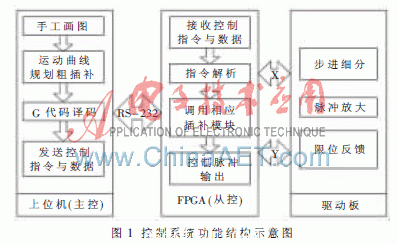 本係統的設計目標是實現兩(liang) 軸聯動的運控係統,主要由PC機、FPGA從(cong) 控板和電機驅動板三個(ge) 部分構成,係統結構如圖1所示。上位機(PC)的主要功能是對係統運行過程進行控製規劃和粗插補(曲線加工規劃)。FPGA從(cong) 控板的主要功能是對加工進行精插補,在此二次插補完成後通過速度補償(chang) 模塊對插補的執行速度進行補償(chang) ,進一步減小插補的偏差,產(chan) 生直接用於(yu) 驅動步進電機進行直線/圓弧運動的脈衝(chong) 信號。驅動電路的作用是將脈衝(chong) 控製信號進行功率放大,以直接驅動電機,同時為(wei) 了提高控製精度,可以使用其細分電路對電機的步進進行1、2、4、8次的細分。