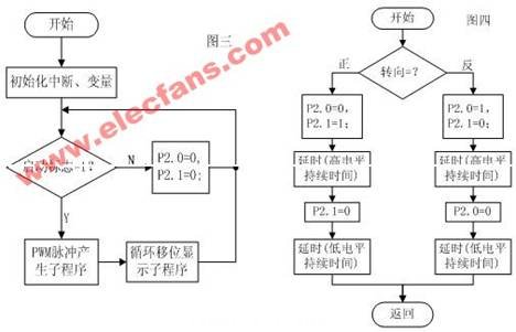 此函數為(wei) 帶參數DLYLEVEL,約產(chan) 生DLYLEVEL*400us的延時,因此一個(ge) 脈衝(chong) 周期可以由高電平持續時間係數hlt和低電平持續時間係數llt組成,本設計中采用的脈衝(chong) 頻率為(wei) 25Hz,可得hlt+llt=100,占空比為(wei) hlt/(hlt+llt),因此要實現定頻調寬的調速方式,隻需通過程序改變全局變量hlt,llt的值,該子程序流程圖如圖四。