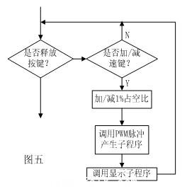 調速檔、持續加/減速:調速檔通過(0-6)共七檔固定占空比,即相應檔位相應改變hlt,llt的值,以實現調速檔位的實現。而要實現按住加/減速鍵不放時恒加或恒減速直到放開停止,就需在判斷是否鬆開該按鍵時,每進行一次增加/減少1%占空比(即hlt++/--;llt--/++),其程序流程圖如圖五。