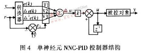 由於(yu) 被控對象模型不確定、不確知,並且存在著外界隨機擾動,為(wei) 了達到較高的控製精度,在被控對象模型離線辨識的基礎上,采用單神經元自適應NNC-PID控製器結構,如圖4所示。