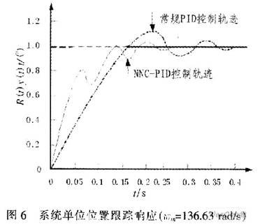 對電液位置伺服機械手係統首先采用常規的PID控製,利用Ziegler-Nichols方法整定PID參數,即控製係統在純比例控製下,調整比例增益,使係統達剜臨(lin) 界穩定,記錄這時的增益ku和臨(lin) 界振蕩周期Tu,即可確定PID的參數,即:kp=0.6Tu,kI=0.5Tu,kD=0.25Tu,最後確定比例、積分、微分係數分別為(wei) :kP=1.02,kI=0.024,kD=0.006,這時係數的位置階躍跟蹤響應如圖6所示。在同等情況下,采用神經網絡NNC-PID控製方法對電液位置伺服機械手係統進行控製,取NNC的初始權值為(wei) PID的調定值,即:v1(0)=1.02,V2(0)=0.024,V3(0)=0.00 6,為(wei) 了保證迭代的穩定性,限製權值的迭代範圍:0.1≤v(1)≤1.3,0.001≤v(2)≤0.06,0.001≤v(3)≤5,這時係統的位置跟蹤響應曲線如圖6所示。通過對比可以看出利用神經網絡NNC-PID方法,由於(yu) 具有學習(xi) 能力,使係統很快收斂於(yu) 位置穩態值,神經網絡NNC-PID控製由於(yu) 能夠實時調整PID參數,使係統的控製性能得到提高,同時對參數時變表現出良好的魯棒性,很好地解決(jue) 了液壓係統的非線性和參數時變問題。