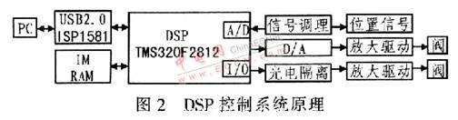 控製係統采用了PC+DSP的控製方案,係統總體(ti) 結構如圖2所示。其中PC機主要用來顯示控製界麵,調節各控製參數,實時顯示各相關(guan) 信號。而DSP則完成低層的控製功能,通過A/D轉換器采集各路信號,經過一定的算法處理後,由D/A口輸出,以及通過I/0口、光電隔離驅動放大電路來控製各電磁閥的開關(guan) 。同時通過通信,向PC機發送采集來的信號,並接收PC機的起動、停止等指令以及各控製參數。