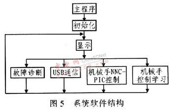 DSP的係統軟件設計是在CCS2000的開發係統下采用C語言設計和編寫(xie) ,采用自頂向下的設計思路,按功能劃分軟件模塊,係統軟件如圖5所示,主要由初始化模塊、故障診斷、USB通信模塊、機械手NNC控製學習(xi) 模塊和機械手NNC-PID控製模塊等組成。