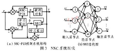 神經網絡PID控製係統結構如圖3(a)所示。從(cong) 控製係統框圖中可以看出,神經網絡PID控製包括兩(liang) 個(ge) 控製子模塊:NNI為(wei) 被控對象模型辨識器,NNC為(wei) 神經網絡PID控製器。NNC-PID控製係統的工作原理是:首先獲取實際被控對象的輸入輸出樣本對,然後利用NNI對被控對象進行離線辨識,當辨識精度達到設定的要求時,通過實時調整NNC的權值係數,使係數具有自適應性,從(cong) 而達到有效控製的目的。#p#分頁標題#e#