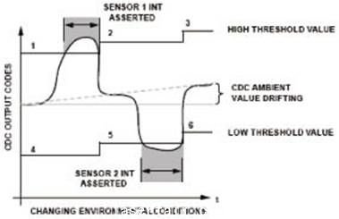 隨著環境條件的變化(例如,溫度或濕度上升),傳(chuan) 感器的環境參數(在用戶沒有與(yu) 傳(chuan) 感器接觸期間,由CDC進行測量)會(hui) 發生漂移。為(wei) 了進行補償(chang) ,需要動態改變高端和低端閾值電平,以確定有效的傳(chuan) 感器接觸。位置2、3、5、6處的參考電平進行重新調整,以保持最佳的閾值參考電平,從(cong) 而自動跟蹤和補償(chang) 漂移誤差。