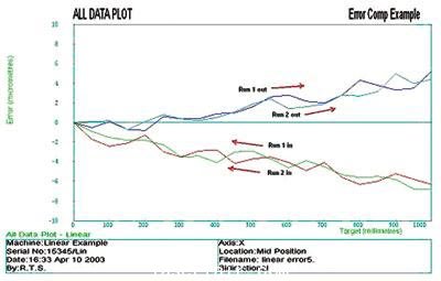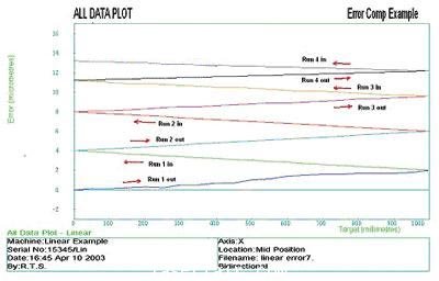 負坡度曲線向外運行和向內(nei) 運行兩(liang) 個(ge) 測試均出現向下的坡度。在整個(ge) 軸線長度上,誤差呈線性負增加,這表示激光係統丈量的間隔短於(yu) 機床位置反饋係統指示的間隔。出現負坡度的可能原因有以下兩(liang) 種:(1)光束準直調整不正確。假如軸線短於(yu) 1m則可能是材料熱膨脹補償(chang) 係數不正確、材料溫度丈量不正確或者波長補償(chang) 不正確。(2)俯仰和扭擺造成阿貝偏置誤差、機床線性誤差。