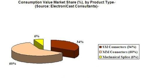 2011年,與(yu) 多模光纖配套使用的光纖連接器占據全球光纖連接器消費市場的60%;其次是單模光纖連接器,占比為(wei) 34%;最後機械接續頭占6%。機械接續頭消費市場預計也將繼續增長。適用於(yu) 光纖到戶安裝,基於(yu) 機械拚接技術的現場安裝連接器應用急劇增長