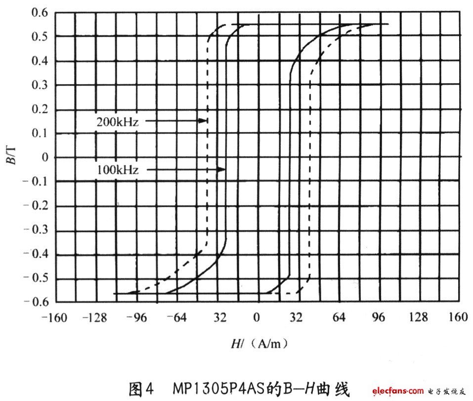 MP1 305P4AS的B-H曲線(亦稱磁滯回線)如圖4所示,B代表磁通密度(單位是T),H代表磁場強度(單位是A/m),圖中的實線和虛線分別對應於(yu) 100kHz、200kHz開關(guan) 頻率。