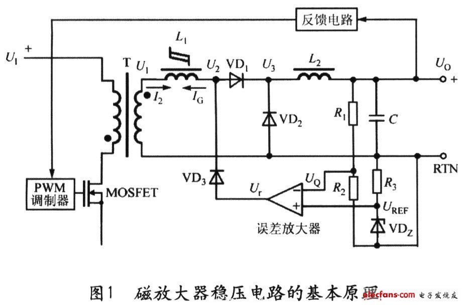由圖可見,改變t1,即可調節U2的占空比:D=t1/T,T為(wei) 開關(guan) 周期。具體(ti) 講,當磁複位時間從(cong) t1減至t2時,D ↑→UO↑。反之,當磁複位時間從(cong) t2增加到t1時,D↓→UO↓。因磁放大器具有“二次穩壓”(一次穩壓是由PWM調製器完成)的作用,故能對UO進行精確調節,獲得高穩定度的輸出電壓。
