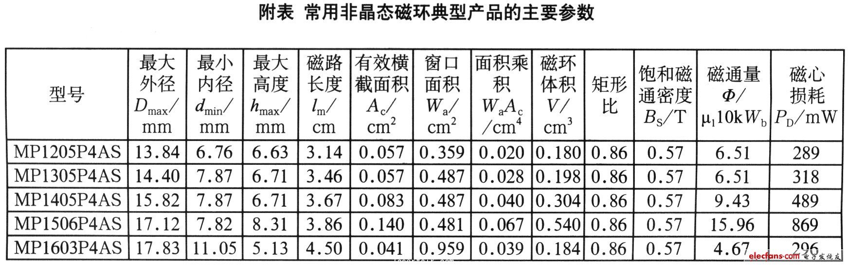 L4采用美國Metglas公司生產(chan) 的MP1305P4AS型高性能非晶態合金磁環,用φ0.10mm漆包線均勻繞製7匝。常用非晶態磁環典型產(chan) 品的主要參數見附表。MP1 305P4AS型號中的“13”代表外徑為(wei) 1 3mm(標稱值), “5”代表高度為(wei) 5mm(標稱值)。其磁路長度為(wei) 3.46cm,有效橫截麵積為(wei) 0.057cm2,質量為(wei) 1.50g,飽和磁通密度為(wei) 0.57T,矩形比為(wei) 0.86,電阻率為(wei) 0.142μΩ·cm,磁心損耗為(wei) 318mW,長期工作溫度<120℃,居裏點溫度為(wei) 225℃(超過此溫度時磁滯現象會(hui) 消失)。