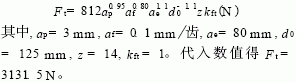(2)切削參數(最大銑削力狀況),使用高速鋼端麵銑刀銑削中碳鋼工件時,刀具直徑為(wei) 125mm,最大銑削速度為(wei) 40m/min。