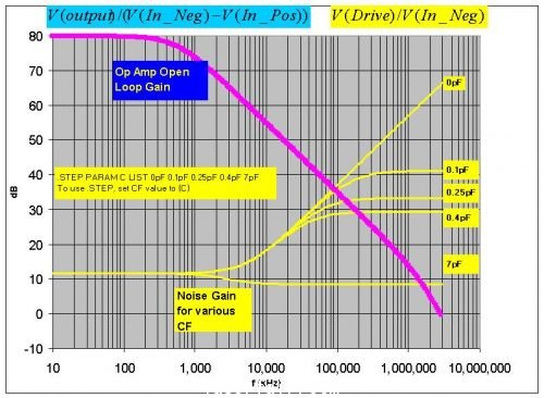 為(wei) 了努力找到合適的補償(chang) 電容值來改善相位裕度,如圖6所示,我們(men) 可以用不同的CF值(圖4電路)和LMH6629開環增益曲線一起繪出噪音增益曲線。噪音增益是V(Drive)/V(In_Neg)。請注意LG的仿真低頻值要大於(yu) 0dB,因為(wei) LMH6629的宏觀模型包括了其差分輸入電阻。