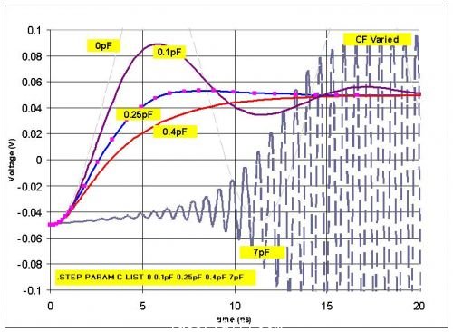 找到最優(you) CF值後,可以重新查看初始的閉環配置(沒有大的電感和電容加入到LG和NG的研究中),在使用最優(you) 的CF值(此時是0.25pF)情況下可以得到階躍響應。圖8示意了不同的CF曲線,證實了CF值不管偏大或者偏小都會(hui) 造成電路的不穩定。同時,在額定振鈴的情況下,最優(you) CF值帶來了非常好的階躍響應,此時可能有一個(ge) 更長的振鈴和穩定時間。顯然,不管是0pF還是7pF,電路都是完全的不穩定狀態。正如圖6所預測的,因為(wei) 7pF的噪音增益和放大器開放環路增益曲線間截距頻率更高,因此,其振蕩頻率高於(yu) 0pF的振蕩頻率。