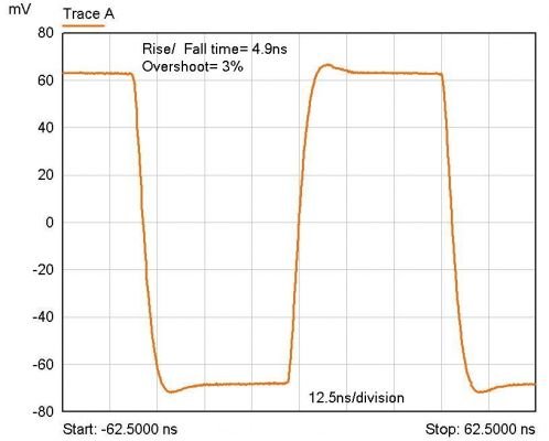 圖10和圖11顯示的是結果頻率和在輸出端分別使用50源和負載端子時的階躍響應。如圖所示,-3dB帶寬時,頻率接近70MHz,沒有峰值。階躍響應曲線在上升階段和下降階段與(yu) 頻率響應相匹配,從(cong) 中可以看到過衝(chong) 最小化了,沒有振鈴,從(cong) 而可以確認電路已經獲得了恰當補償(chang) 。為(wei) 了對仿真觀察進一步核實,實驗台測試檢測了在沒有補償(chang) 電容時的峰值及直接經過RF時10pF電容產(chan) 生的全上升振蕩。