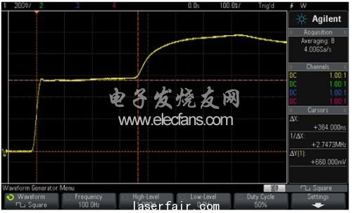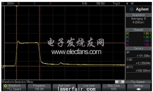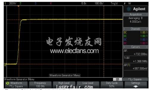 對於(yu) 電纜測試,波形發生器可配置為(wei) 輸出一個(ge) 100Hz、0V~1V的方波,如圖10所示。取平均法可以降低噪聲;觸發點的位置設在左側(ce) 。使用光標對波形參數進行手動測量。這種測試方法等效於(yu) 一個(ge) 低速時域反射計(TDR)。
