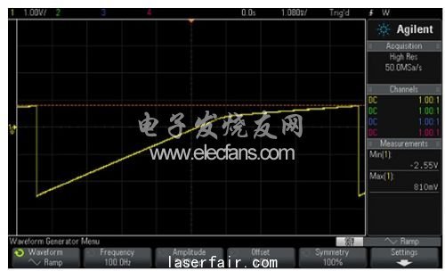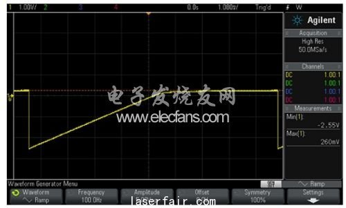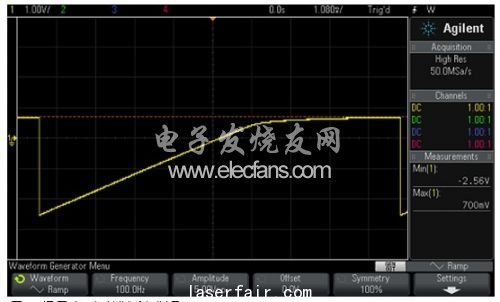 故障二極管顯示為(wei) 開路或短路。開路二極管的圖像如圖6所示,而短路二極管則像是一條水平線。LED也可通過這種方法進行測試。如果需要,通過提高波形發生器的偏置,可為(wei) LED提供更多的電壓。