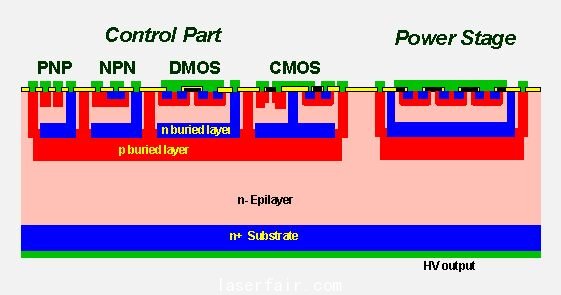 這個(ge) 特性使共射-共基放大器結構的開關(guan) 性能比一個(ge) 標準雙極晶體(ti) 高出很多,可與(yu) 一個(ge) 場效應MOS晶體(ti) 管媲美。因此,我們(men) 說這個(ge) 器件沒有電荷貯存效應。這項技術的控製部分是采用BCD(雙極-互補MOS-雙擴散MOS)單元庫實現的。