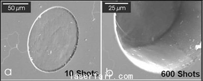 圖2. 鑽石經193nm準分子激光燒蝕形成的凹坑:左圖為(wei) 10個(ge) 激光脈衝(chong) 情況,右圖為(wei) 600個(ge) 激光脈衝(chong) 情況。凹坑的平整度表明了準分子激光光束在整個(ge) 照明區域具有極高的均勻性。