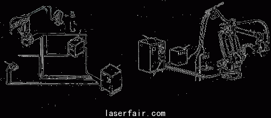 焊接機器人主要包括機器人和焊接設備兩(liang) 部分。機器人由機器人本體(ti) 和控製櫃(硬件及軟件)組成。而焊接裝備,以弧焊及點焊為(wei) 例,則由焊接電源,(包括其控製係統)、送絲(si) 機(弧焊)、焊槍(鉗)等部分組成。對於(yu) 智能機器人還應有傳(chuan) 感係統,如激光或攝像傳(chuan) 感器及其控製裝置等。圖1a、b表示弧焊機器人和點焊機器人的基本組成。