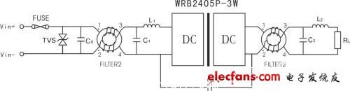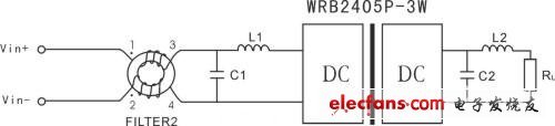 方案一 共模幹擾電路中的一些共模幹擾,我們(men) 可以考慮在模塊的輸入端采用共模扼流圈FILTER2進行抑製(MORNSUN公司有此配套產(chan) 品),如圖2所示。